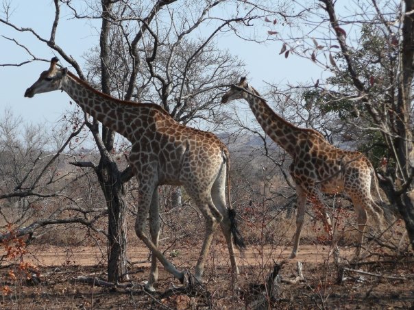 (Two giraffe seen through dry winter bush in the Sabi Sands Game Reserve. During the winter months of May to September, the bush is much thinner making animal sightings easier).