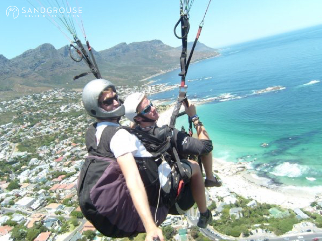 (Sandgrouse Travel's Jonny tandem paragliding with a professsional guide over the selubrious Camps Bay in Cape Town).
