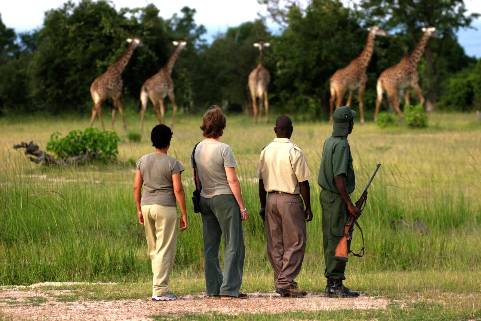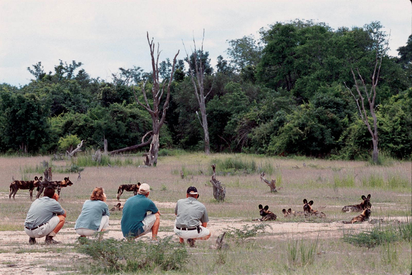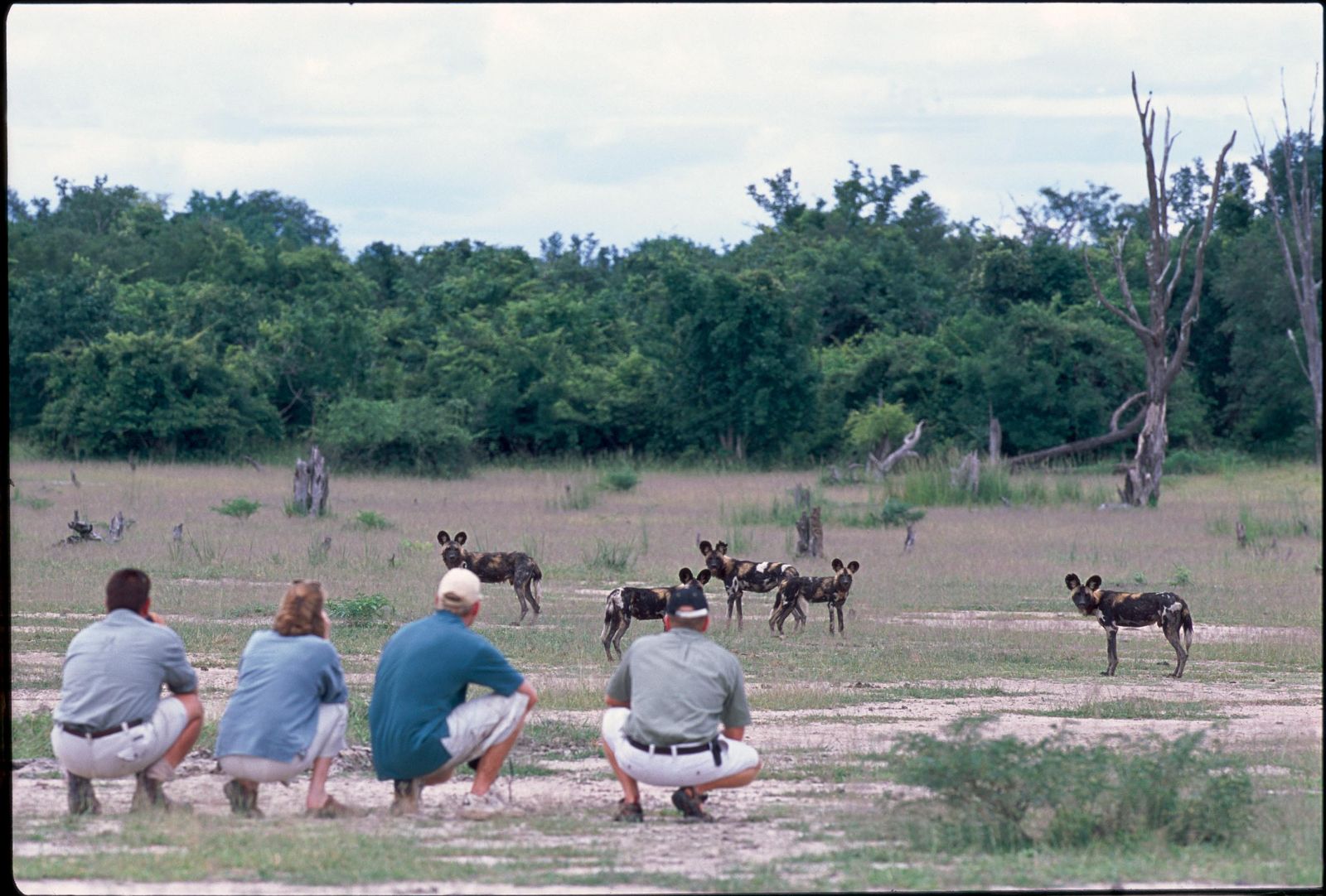 (Guests enjoy getting a privelaged view of African Wild Dogs on a walking safari).